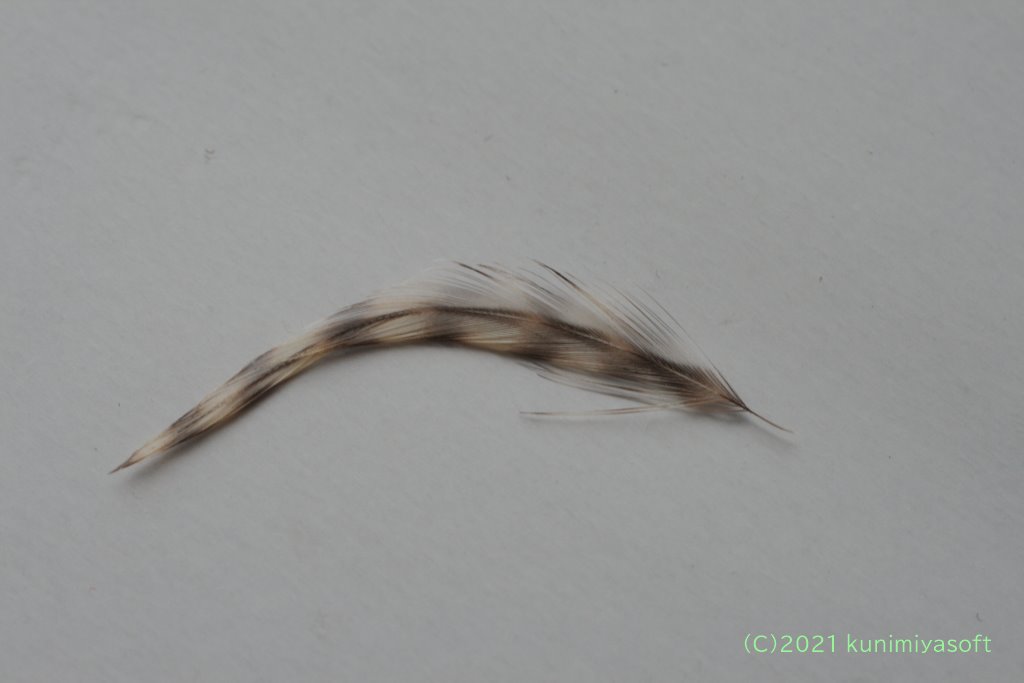 羽の先端4~5cmくらいを利用します(羽の種類により変わります)。切り取ったら、根本の毛を取っておきましょう。羽を鉤に糸で固定する部分になります。