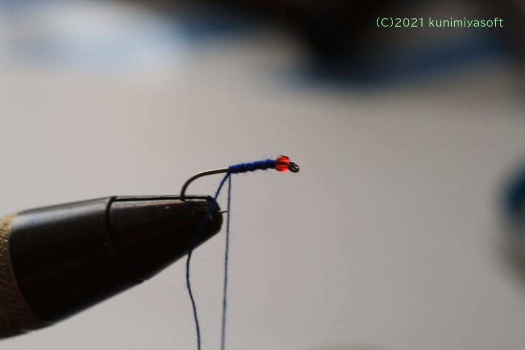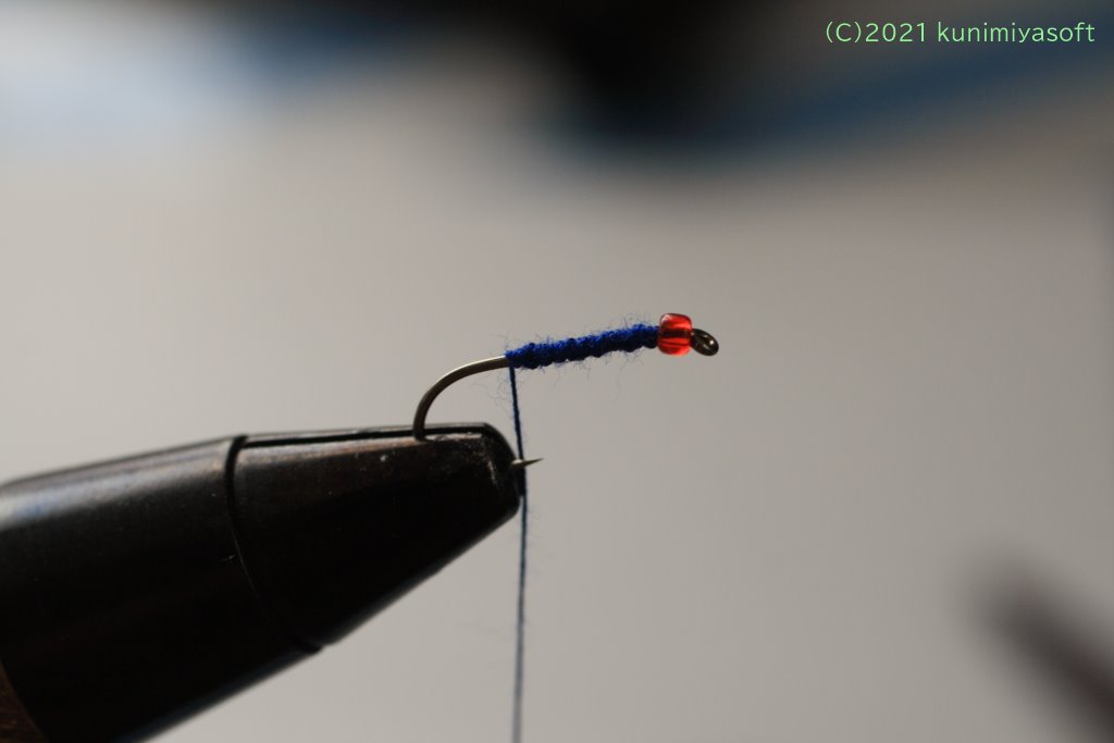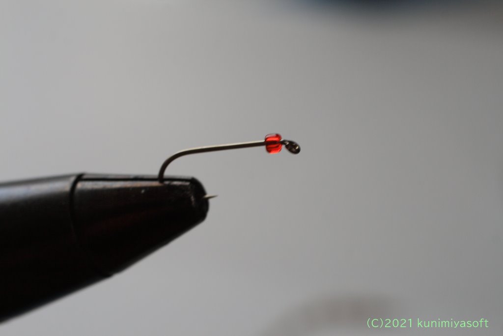 鉤にビーズ玉を通しました。これは100均で購入したものです。別になくても構いませんが、シンプルな毛鉤のアクセントに良いでしょう。